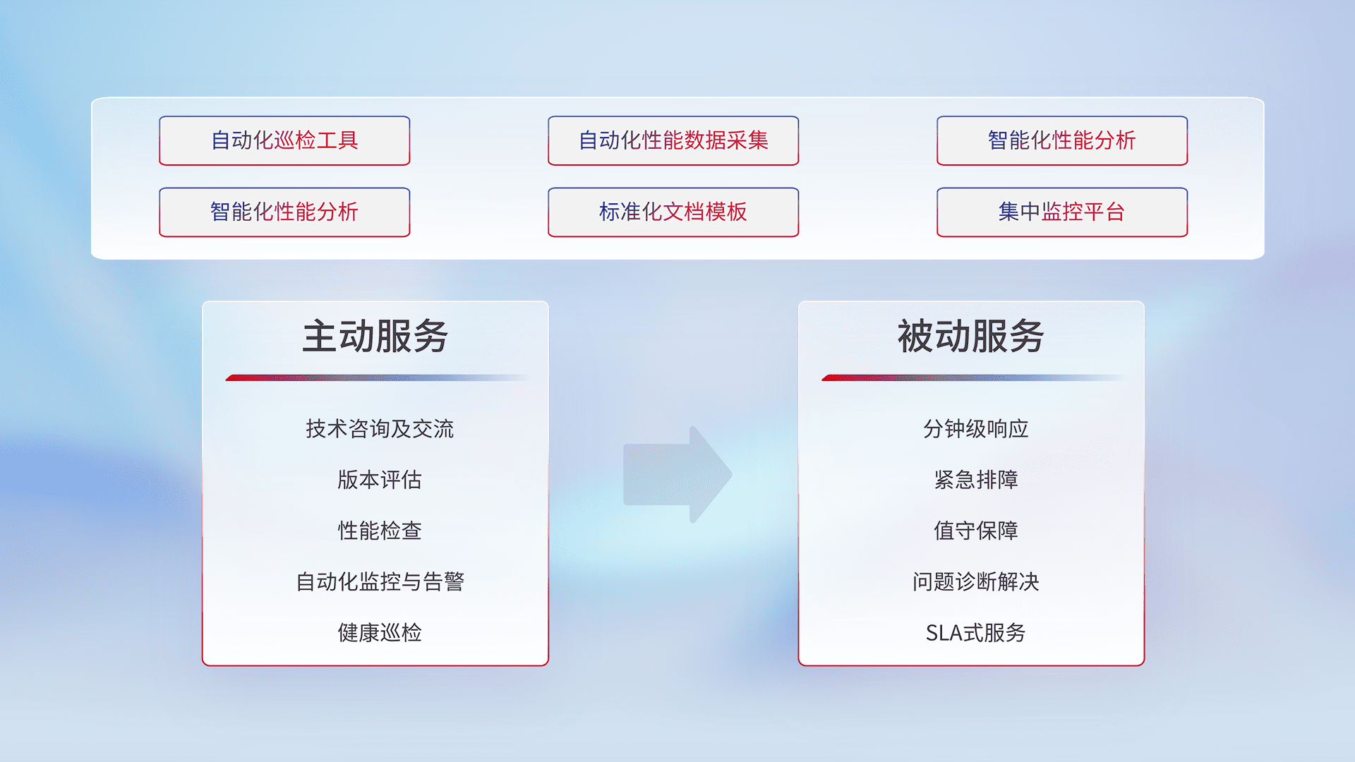 智能化工具和标准化文档,,,,保障服务质量,,提供主动服务(包含技术咨询、、版本评估、、性能检查、、、、自动化监控与告警、、、健康巡检)和被动服务包含(分钟级响应、、紧急排障、、值守保障、、、、问题诊断解决、、、、SLA服务)。。。。
